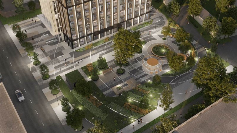 В офисном центре разместится вся необходимая инфраструктура, доступная жителям района. Среди запланированных объектов в двухуровневом стилобате – кафе и рестораны, столовая с открытым доступом, фитнес-студия, аптеки, банкоматы. Каждый корпус получит свое цветовое решение и дизайн-код фасада, выполненного в панорамном остеклении с динамичными алюминиевыми ламелями. Единый стилобат из кирпича темно-серого оттенка выступит подиумом для офисных башен, которые композиционно смещены относительно друг друга.